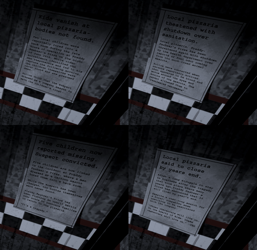 • La mayoria de la historia de Freddy Fazbear Pizzeria se ha desvelado unicamente gracias a las alucinaciomes de loa periodicos que cada noche cambian en la camara de la puerta izquierda